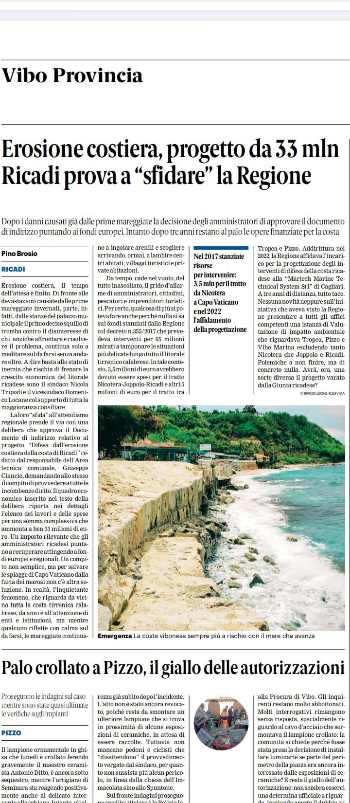 «La differenza, questa volta – scrive Mobrici –, è che i 33 milioni non ci sono nemmeno sulla carta. Parlare di “progetto” è dunque un’operazione di pura propaganda, una cortina di fumo utile solo a nascondere cinque anni di immobilismo assoluto sul fronte dell’erosione costiera. Eppure, l’erosione a Ricadi non è una questione marginale: è un problema serio e urgente, che minaccia non solo l’ambiente ma anche centinaia di posti di lavoro e l’intera economia di un comparto strategico come il turismo. Ricadi rappresenta da anni un centro di eccellenza regionale, con presenze turistiche di rilievo nazionale e internazionale, e il suo litorale è il motore che traina l’economia di tutta la provincia. Lasciare che il mare continui a cancellare spiagge, stabilimenti e strutture ricettive equivale a condannare un intero territorio al declino. Per questo motivo, appare davvero inaccettabile continuare a spacciare per risultati concreti ciò che non è altro che un atto di indirizzo privo di fondi e di progettualità reale. La cittadinanza merita chiarezza, non illusioni».